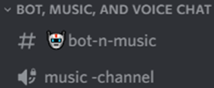 Bot, Music and VC: We have a bot for our members to view their points and rank within our discord server. Music channel and Voice Chat channels are for our members to use.