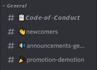 These are your first channels. We request that you read the Code of Conduct and Announcements.